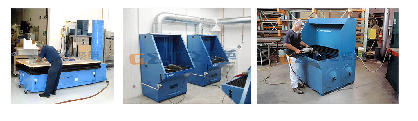 針對(duì)于小工件人工(打磨/拋光)產(chǎn)生煙、粉塵,具有風(fēng)量小,濃度低等特點(diǎn),使用自凈式打磨臺(tái)、抽吸收打磨臺(tái)粉塵收集治理。