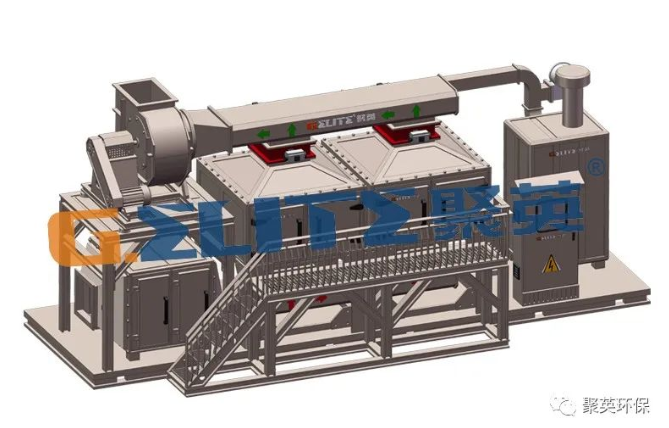 由環(huán)保離心風(fēng)機(jī)將大風(fēng)量、低濃度有機(jī)廢氣吸入沸石吸附床,在吸附床內(nèi)與多層蜂窩狀沸石充分凈化(吸附),沸石內(nèi)部逐漸富集濃縮大量有機(jī)廢物,而潔凈的氣體則排入大氣;通過(guò)燃燒裝置產(chǎn)生的高溫氣體經(jīng)換熱之后通入活性炭吸附床,使內(nèi)部有機(jī)廢物300-500℃高溫氣化從活性炭孔隙中逸散而出,此時(shí)的廢氣濃度遠(yuǎn)遠(yuǎn)高于初始吸附的廢氣濃度,然后進(jìn)入催化燃燒裝置(350℃)進(jìn)行氧化分解成CO 和H O等無(wú)害氣體,氣體經(jīng)由熱交換器將熱量傳遞再次用于脫附,排入大氣,以此完成一整套凈化流程。